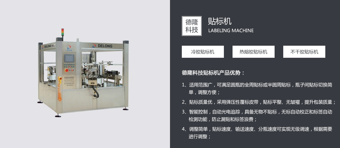 青島德隆自1995年創(chuàng)建以來,始終秉承創(chuàng)新與發(fā)展的優(yōu)良傳統(tǒng),依靠技術(shù)與服務(wù)贏得客戶的信賴與尊重。在貼標機向?qū)W⒒⒍嘈袠I(yè)領(lǐng)域發(fā)展并成就了中國異型瓶貼標市場的經(jīng)典之后,應(yīng)市場不斷變化的客戶需求,優(yōu)化產(chǎn)品結(jié)構(gòu),引進吸收國內(nèi)外的流體包裝設(shè)備理念,在貼標機專業(yè)化地位穩(wěn)固的前提下,逐步實現(xiàn)關(guān)聯(lián)產(chǎn)品的多元化。   目前,青島德隆已經(jīng)成為國內(nèi)能同時滿足圓瓶、方瓶、扁瓶、錐度瓶、球形瓶、定位瓶等瓶型的高、中、低速多功能冷(熱)膠貼標領(lǐng)域的廠家。隨著碼/卸(瓶/罐)垛機、沖瓶機、灌裝擠(旋/壓)蓋機、全自動紙箱包箱設(shè)備、排序機、機器人碼/卸垛設(shè)備、激光噴碼機的運行成功,一個真正的流體包裝設(shè)備方案解決專家已經(jīng)成熟。   青島德隆集團的···......[查看詳情]